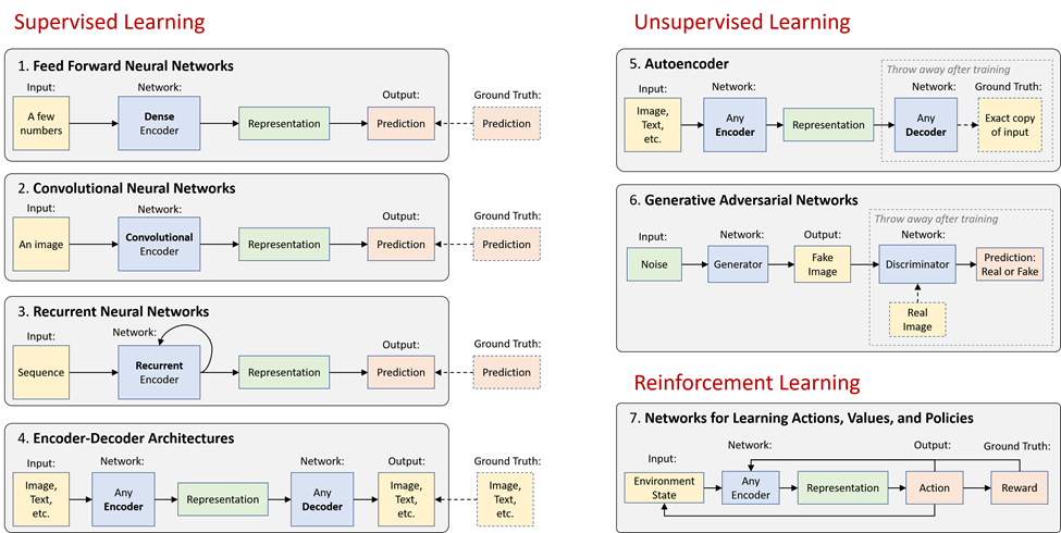- Supervised Learning: Teaching with labeled examples (e.g., flashcards).