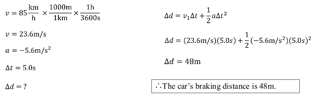 A car is travelling 85 km/h. If it slows at 5.6 \( m/s^2 \) and it takes 5.0s to stop, what is the braking distance?