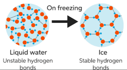 - Lakes freeze from the top to the bottom --> Less dense as solid