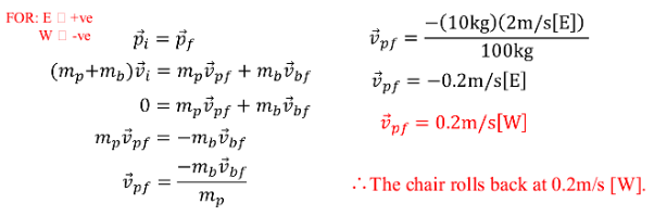 A person on a frictionless rolling chair, with combined mass of \( 100 kg \), throws a \( 10 kg \) medicine ball with a velocity of \( 2 m/s \) [E]. What is the velocity of the rolling chair after the ball is thrown?SOLUTION: