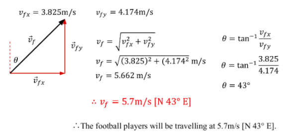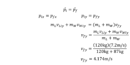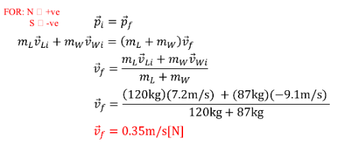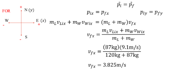 A \( 120 kg \) linebacker travelling at \( 7.2 m/s \) [N] tackles an \( 87 kg \) wide reciever travelling at \( 9.1 m/s \) [E]. What is the speed of the pair right after the collision?SOLUTION: