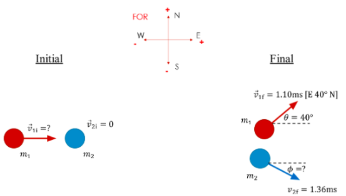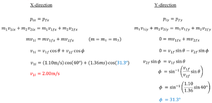 Two marbles of equal mass collide. One of the marbles are initially at rest. After the collision one marble acquires a velocity of \( 1.10 m/s \) at an angle of \( 40^o \) from the original direction of motion. The other marble acquires a speed of \( 1.36 m/s \). What was the initial speed of the moving marble?SOLUTION: