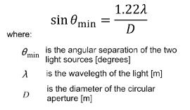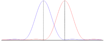 • For two distinct sources of light to be resolved by the device the diffraction maximum of one needs to at least coincides with the first minimum of the other