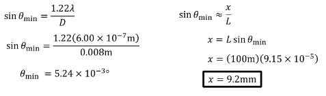 A camera lens has an aperture of 0.8cm and is trying to take a picture of a wall 100m away. If the wall is red (\( \lambda \sim \) 600nm). What is the physical limit on the resolution of the image, in other words, what is the separation of two objects on the wall that can be seen as distinct.