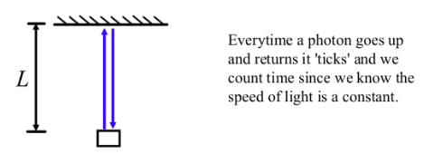 Each contain a 'clock'. This clock uses a lighbulb and a detector to measure time. It counts the time it takes for light to leave the bulb, hit a mirror and return to a detector.