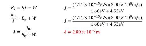 What wavelength of light is required to eject electrons from Tungsten (W=4.52eV) if the maximum kinetic energy of the electrons is 1.68eV.