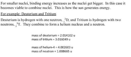 Small nuclei (mass less thatn 56) tend to combine with other nuclei, undergo fusion, to increase the binding energy. The higher the binding energy the more stable the nuclei.